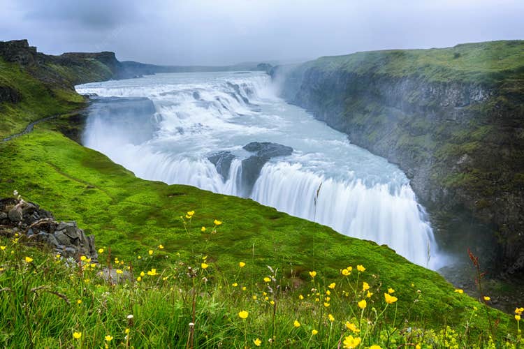 Nearby, the Gullfoss waterfall, another Golden Circle highlight, showcases a dramatic and vast two-tier cascade. The area has multiple viewing platforms to enjoy its breathtaking flow and rainbows.