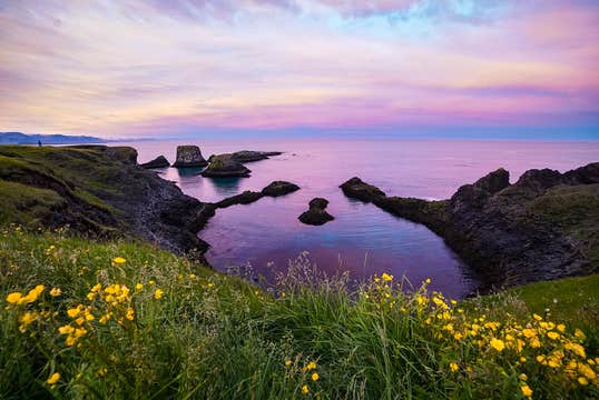 Discover the charm of Arnarstapi and Hellnar, quaint fishing villages where time seems to pause. A scenic walk along the coast between these villages reveals natural wonders like basalt columns and sea arches alongside a rich array of seabirds.