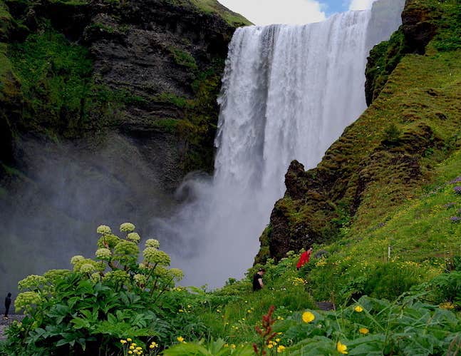 Marvel at the grandeur of Skogafoss waterfall, with its mighty torrent of water thundering down, often embellished with a vibrant rainbow on sunny days.