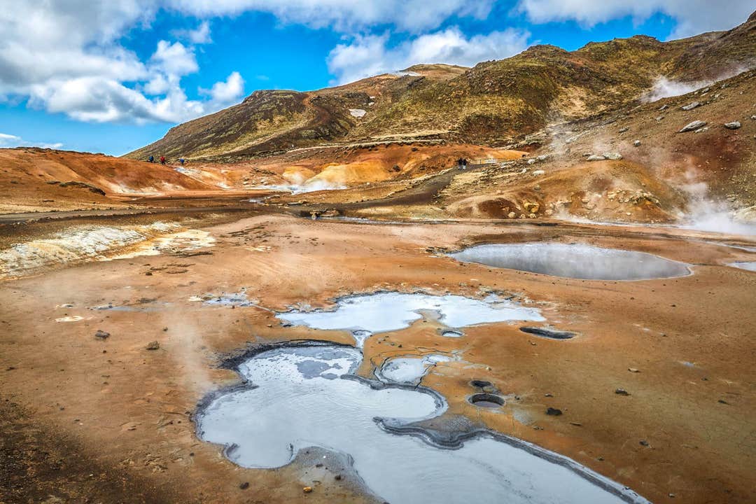 To see even more hot springs, you’ll head to Krysuvik, where a pathway leads through many bubbling pools and steaming vents amongst brightly colored landscapes dyed by volcanic elements.