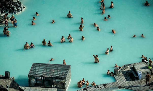 Once you reach the Blue Lagoon geothermal spa, you can change into your bathing suit and begin enjoying the soothing effects of its naturally heated water. The water’s temperature ranges between 98 and 102 F (37 and 49 C). Since tickets are sold separately, you’ll need to arrange your Blue Lagoon admission ahead of time.