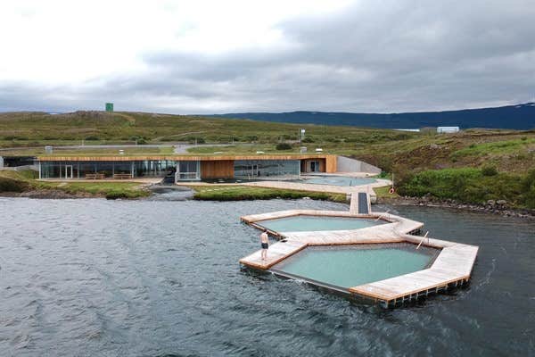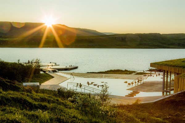 The final stop is Vok Baths, a modern geothermal spa located just outside Egilsstadir. Built on the edge of Lake Urridavatn, the baths feature floating pools with clear views of the surrounding nature.