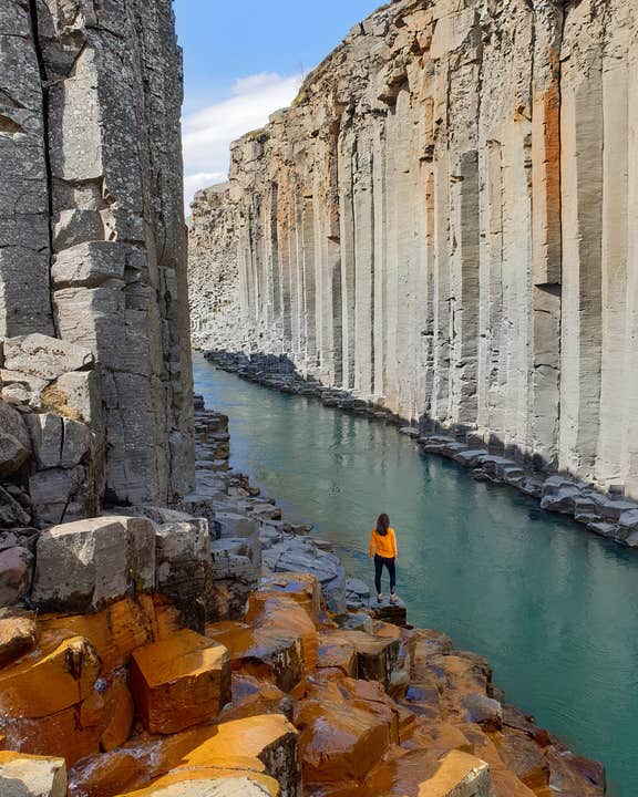 The next stop is the Studlagil Canyon, one of the region’s most breathtaking geological wonders. This narrow gorge is lined with tall basalt columns formed by volcanic activity and carved by the Jokulsa a Dal River.