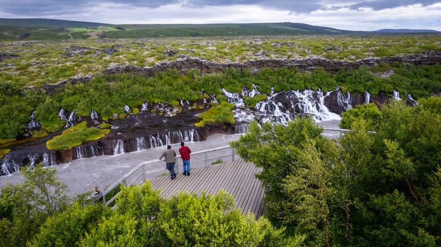 The journey takes you to Hraunfossar and Barnafoss, two of Iceland’s most unique waterfalls. Hraunfossar, also known as the Lava Falls, is a mesmerizing series of small waterfalls that emerge from beneath a lava field.