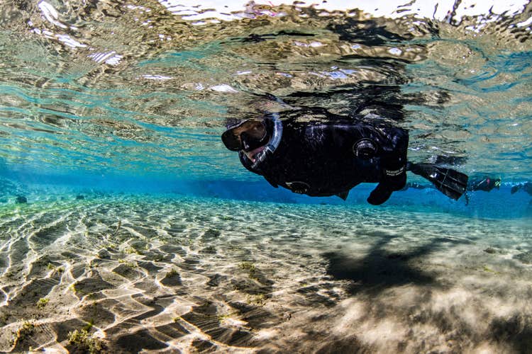 Your guide will provide you with top quality gear, including a dry suit, a fleece undergarment, mask, snorkel and fins. You will be in the water for about 30 minutes, during which time you will explore the four parts of Silfra: Big Crack, the Hall, the Cathedral and the Lagoon. The water in Silfra is a steady 2-3°C. At the end of the tour, warm up with hot chocolate and cookies.