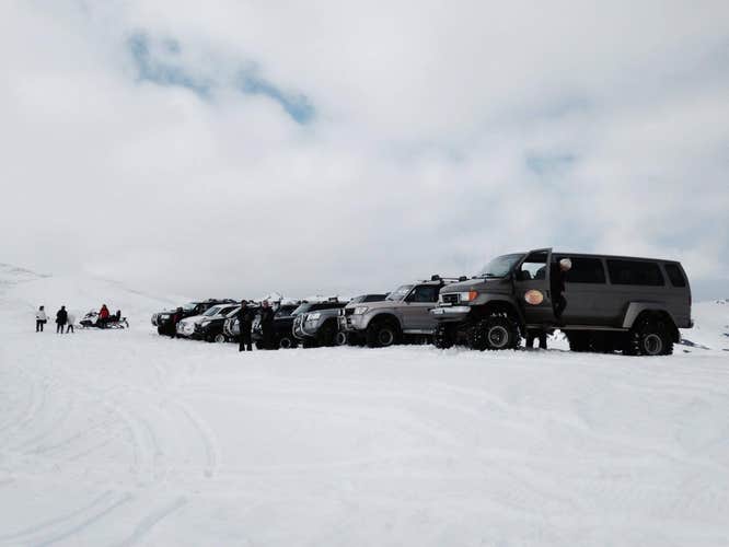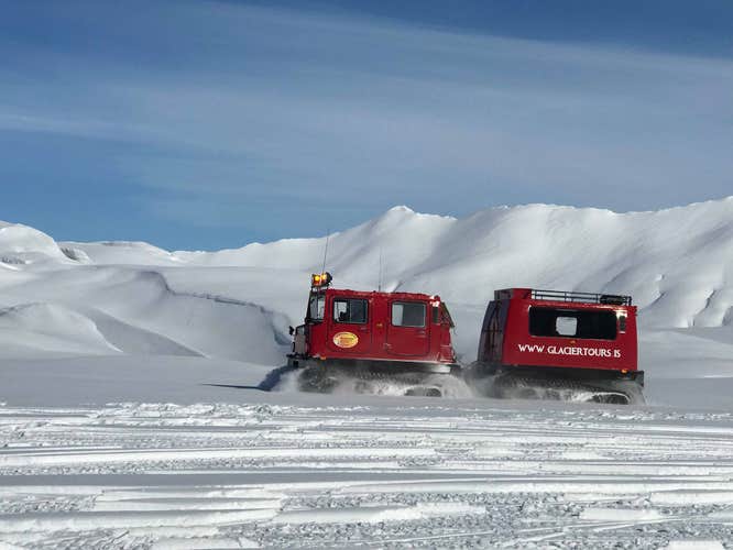 Depending on the weather, you will either continue onto the glacier on your large glacier jeep, which can easily climb up snow-covered hills with a little help from your expert driver who is more than willing to share his knowledge of the glacier and region. Alternatively, you will leave the jeep behind in exchange for a snowcat with its tank-style tracks.
