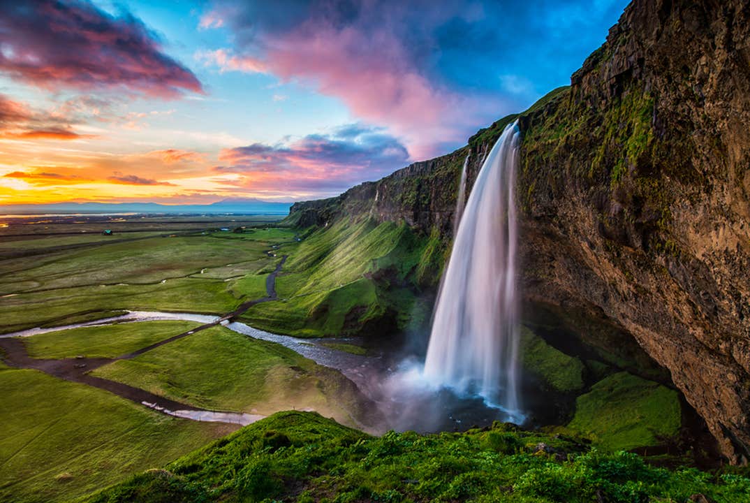 Your first stop for the day is the iconic Seljalandsfoss waterfall. Located just off the Ring Road, the Seljalandsfoss waterfall stands approximately 200 feet (60 meters) tall, with water plunging from a high cliff into a shallow pool below. However, what makes Seljalandsfoss especially famous is the cave-like pathway that runs behind it.