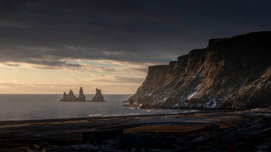 Next, stroll along Vikurfjara, a peaceful black sand beach near the town of Vik. Less crowded than Reynisfjara, it’s perfect for taking in dramatic sea stacks and snapping photos without the crowds.