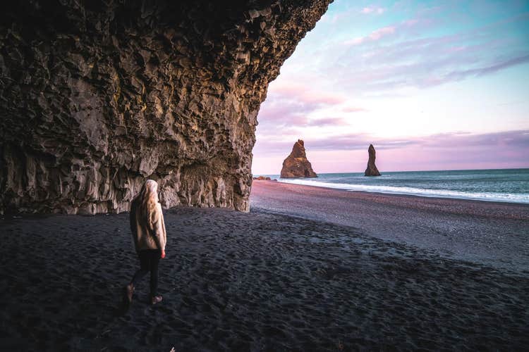From there, the South Coast tour continues to the famous Reynisfjara Black Sand Beach. Towering basalt columns line the shore while the Atlantic sends waves that crash with force against the sand. Just a short distance away, your guide may take you to smaller, quieter stretches of coast for a more peaceful moment by the sea.