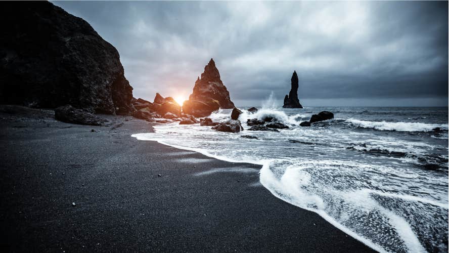 After your glacier hike on Solheimajokull, you’ll visit Reynisfjara Black Sand Beach. It’s a world-famous attraction known for its towering basalt columns, roaring waves, and the Reynisdrangar Sea Stacks.