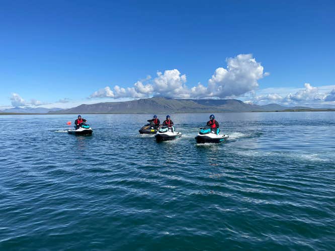 After a short safety briefing, it’s time to climb onto your user-friendly jet ski and head out into Faxafloi Bay. The ride starts with the sun hanging low in the sky, casting golden light over the waves.