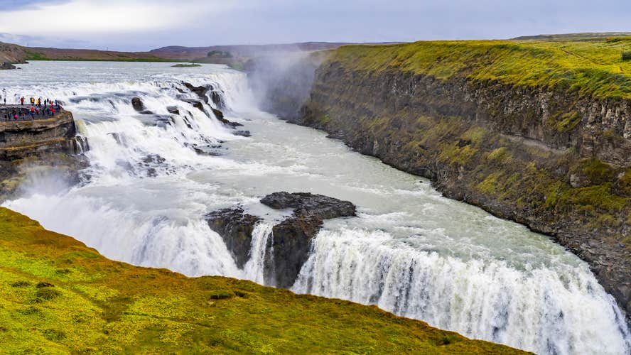 You’ll see Gullfoss waterfall’s two majestic cascades. The upper tier drops approximately 36 feet (11 meters), followed by a dramatic plunge of 69 feet (21 meters) into a rugged canyon below. You can also explore Gullfoss from various vantage points, thanks to well-maintained paths and viewing platforms.