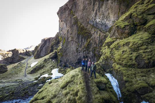 Next, it's on to the Stakkholtsgja canyon. You'll hike around 1.25 miles (roughly 2 kilometers) into the narrow canyon, navigating its rocky pathways and often wading through the meandering stream.