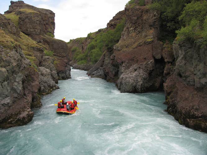 Once on the river, you will enter the mighty West Glacial Canyon, with its high walls and towering cliff faces. You will then paddle along the white river between enormous rock gorges covered in luscious green flora.