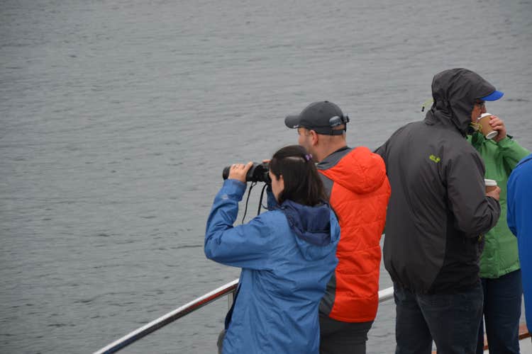 The most common whales in our bay are the baleen whales, minke whales, humpback whales, white-beaked dolphins and harbour porpoises. Besides the whales, we also see a lot of sea birds — different kinds of ducks and seagulls, puffins, razorbills, kittiwakes, sea gannet and more. Occasionally we see killer whales, pilot whales and other types. Although highly unusual, fin whales and blue whales have been seen on occasion.