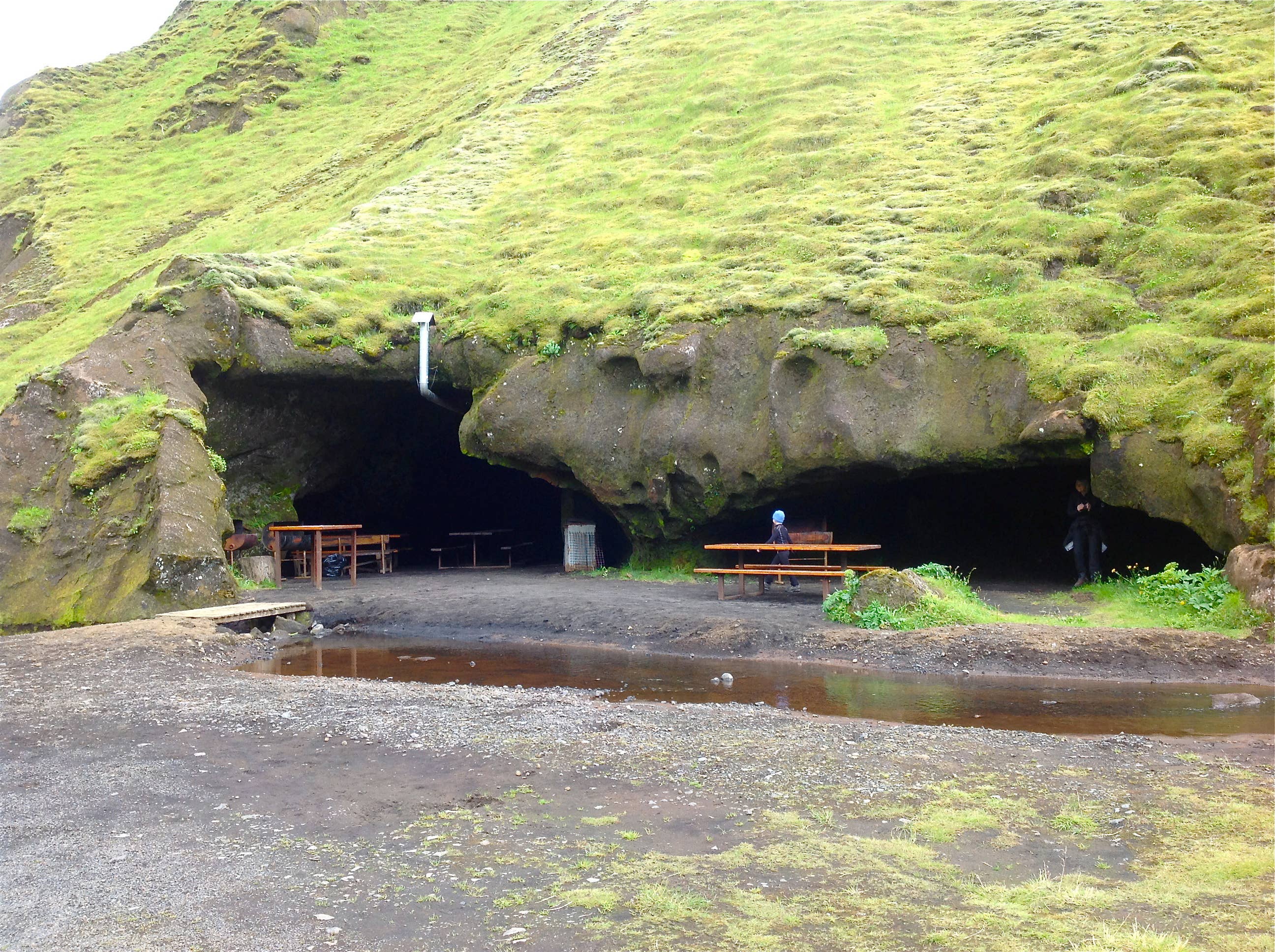 Folks: Þakgil is amazing. A flat valley, with jagged slopes rising up on all sides, covered by that beautiful velvet green that was everywhere and brooks running down them. The landscape is very reminiscent of Þórsmörk, which is considered one of the most breathtaking areas of Iceland. Also - as we had been told - the mountains provide perfect shelter from the pesky wind that is everywhere here in Iceland. Not only that, but there is actually a cave - a cave - for eating in. Yep. There are barbecues outside, picnic tables inside, and even a wood burning stove to provide warmth. The crowning glory are metal holders that are stuck into the wall for holding candles. EXQUISITE.