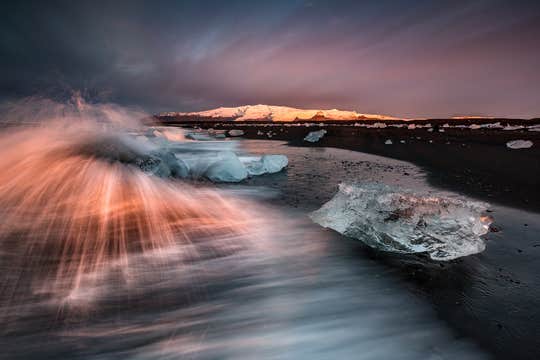 Når du ankommer til gletsjerlagunen, kan du beundre isbjergene, der flyder i gletsjersøen, mens de driver ud i havet. Glem ikke at stoppe ved Diamantstranden for at se de isbjerge, der er skyllet op på kysten.