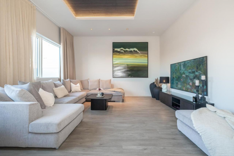 Step onto one of the apartment’s three private balconies and enjoy beautiful sea views and nearby mountains. Relax in the stylish living room, featuring a comfortable sofa and a dining area perfect for shared meals or winding down after a day of exploring.
