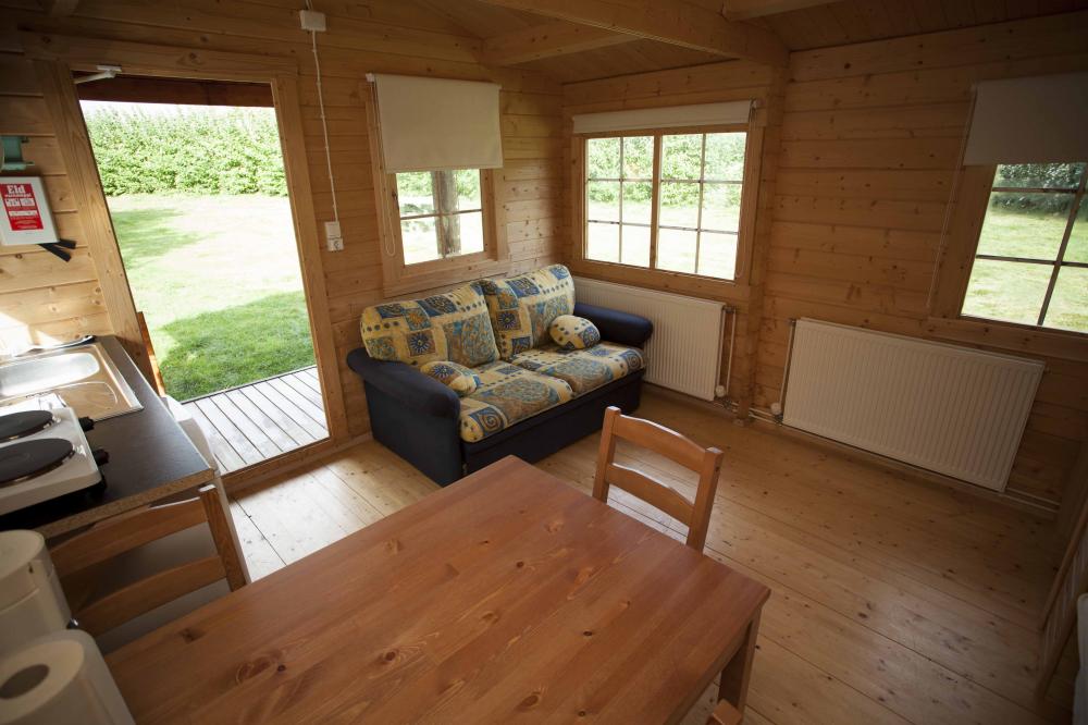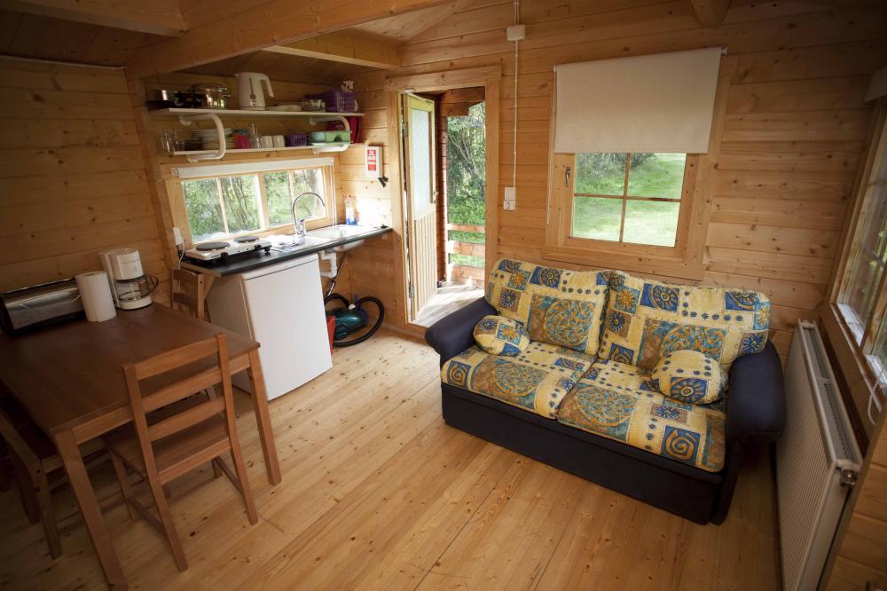 Uden for hytten er en lille overdækket veranda, og der er træbænke få skridt væk, hvor du kan nyde dit måltid udendørs eller se nattehimlen.