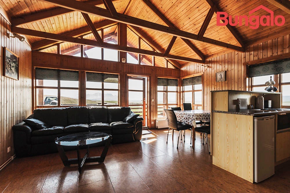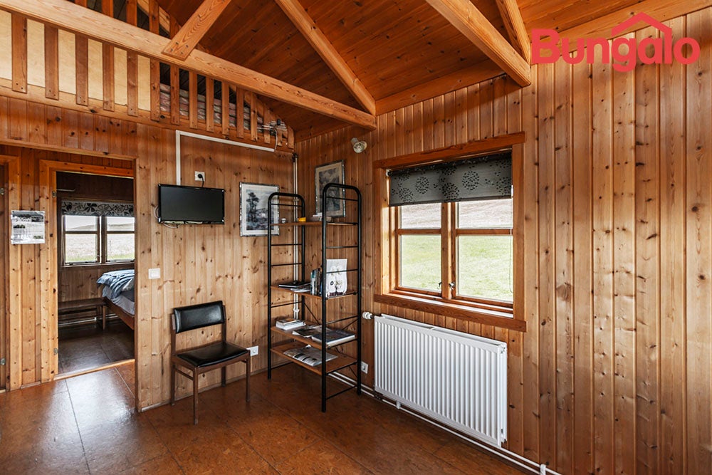 Stóra Giljá 2 er designet i rustik stil med trælameller og minimalistiske møbler. Det har to soveværelser med senge til fire gæster og en hems til to mere. Dets enkelt badeværelse er veludstyret med toilet, bruser, håndvask og spejl. Sengelinned og håndklæder leveres. Du kan anmode om en tremmeseng, hvis du rejser med et lille barn.