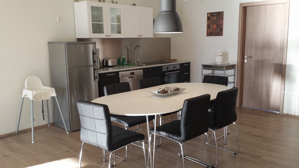 Die Küche ist komplett ausgestattet mit Backofen, Kühl- und Gefrierschrank, Toaster, Kaffeemaschine und Geschirrspüler. Die Wohnung verfügt außerdem über einen Balkon und einen Grill mit Gartenmöbeln, die sich ideal zum Kochen im Sommer eignen.
