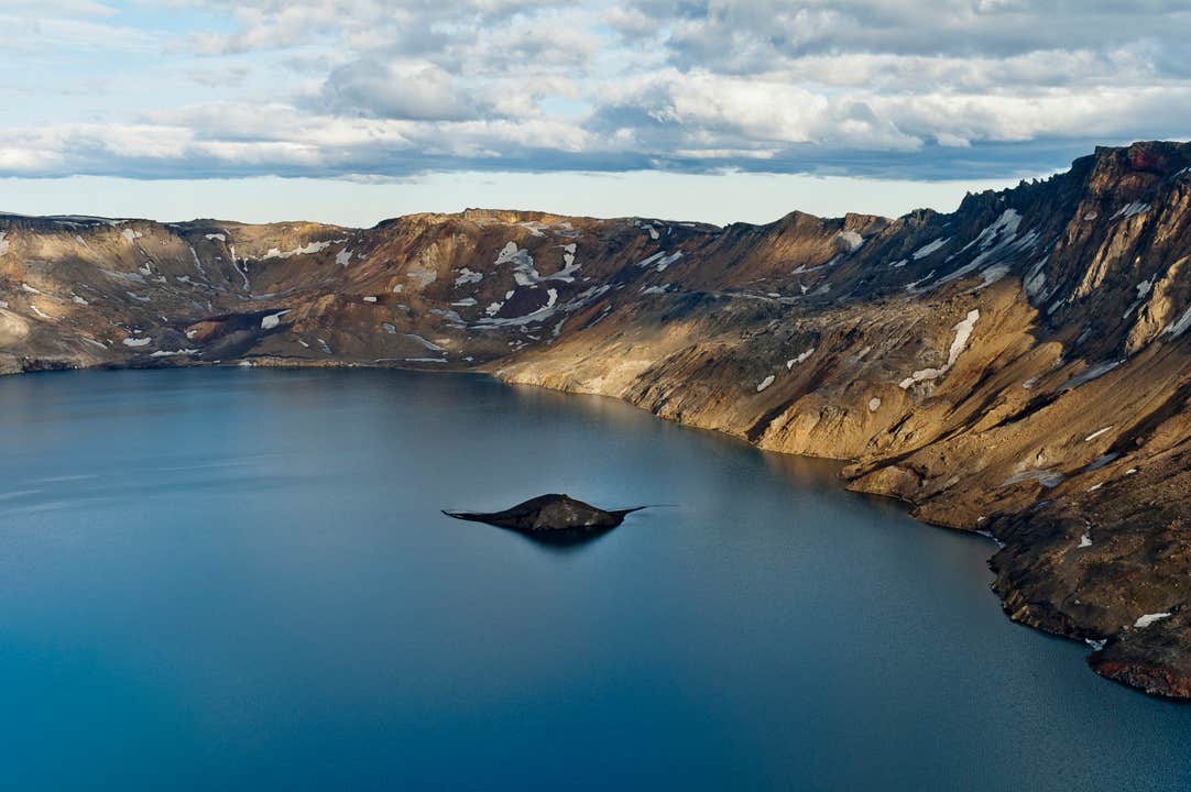 In einem der Krater liegt der malerische Oskjuvatn-See, Islands zweittiefster See. Das tiefblaue Wasser bildet einen faszinierenden Kontrast zur kargen Vulkanlandschaft.