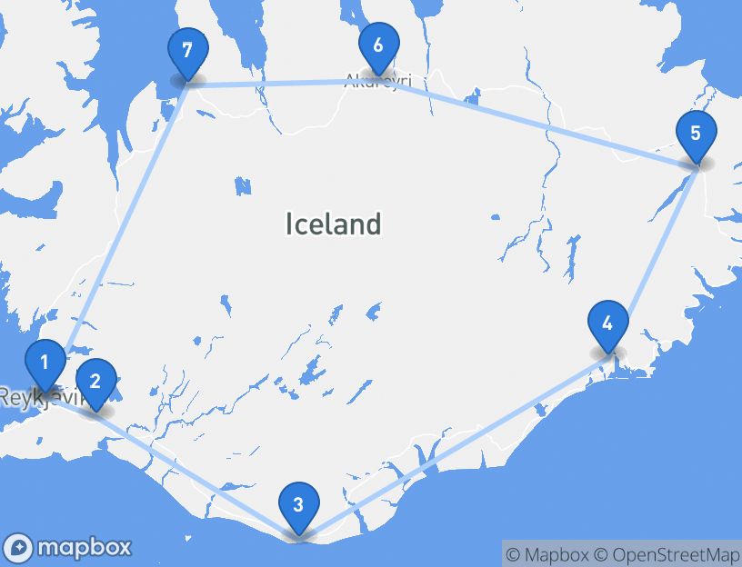 Diese Tour ist für ihr gemächliches Tempo bekannt und führt auch durch die magischen Landschaften der Ostfjorde und Nordislands. Der See Myvatn offenbart eine durch vulkanische Aktivität geformte Landschaft, während Akureyri, die Hauptstadt des Nordens, mit ihrem kulturellen Reichtum und ihrer landschaftlichen Schönheit begeistert.