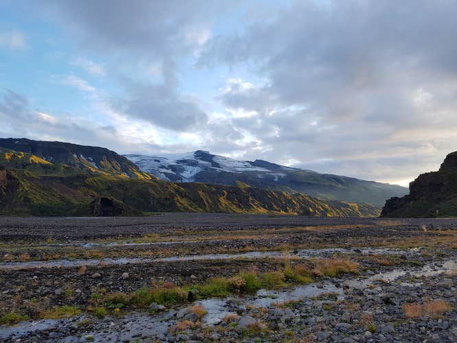 Der Startpunkt der Wanderung liegt an der Baldvinsskali-Hütte, von der sich dir ein atemberaubendes Panorama eröffnet: Der berüchtigte Gletscher Eyjafjallajökull, der Myrdalsjökull sowie der Vulkan Katla sind von hier aus sichtbar und sorgen für eine dramatische Kulisse. Wie an vielen Stellen dieser Route lohnt sich auch hier ein kurzer Halt für einmalige Naturaufnahmen.