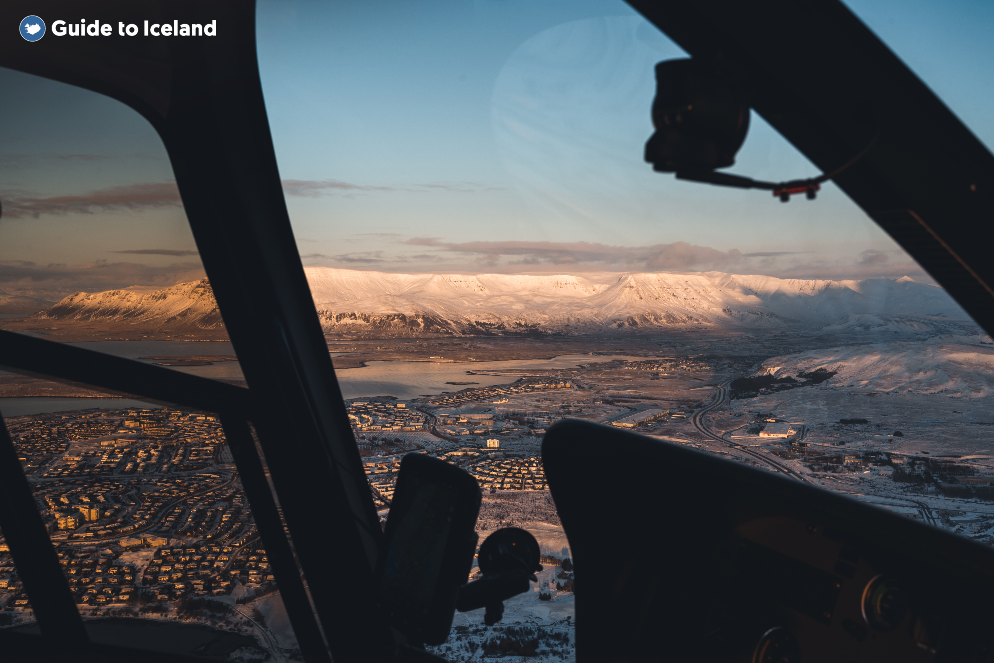 Es ist ein einfach unbeschreibliches Gefühl, mit dem Hubschrauber aufrecht in den Himmel zu steigen, und Reykjavík, mit seiner Patchworkdecke aus bunten Blechdächern, zu bestaunen. Du hörst die Propeller über dir gedämpft rotieren, während du über die Sehenswürdigkeiten der Stadt fliegst.