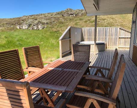 El ambiente acogedor se extiende fuera de cada cabaña con su terraza, zona de barbacoa y bañera de hidromasaje privada. Disfrute sumergiéndose en las relajantes aguas de la bañera de hidromasaje mientras está rodeado de las tranquilas vistas a las montañas del sur de Islandia.