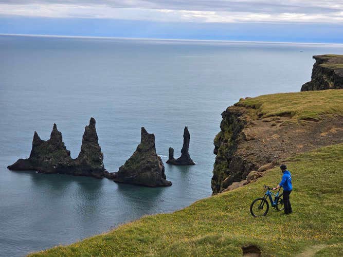 El sendero por el lado este de Reynisfjall revela vistas panorámicas del pueblo, sus playas de arena negra y la imponente montaña Hjorleifshofdi. Este paisaje agreste, combinado con la riqueza cultural de la región, crea un telón de fondo excepcional para una aventura en bici.