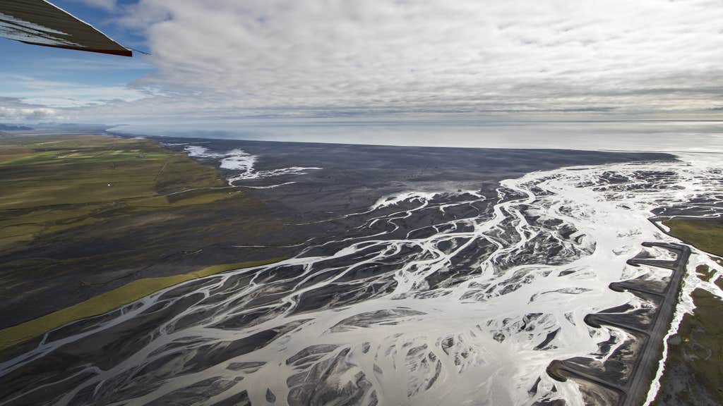 Sobrevolarás Skeidararjokull, una lengua glaciar del Vatnajokull, el glaciar más grande de Islandia. Su agua de deshielo da lugar a varios arroyos que atraviesan las llanuras de arena negra de Skeidararsandur. En el borde occidental del glaciar, el agua de deshielo bloqueada por el hielo de Vatnajokull se acumula en un pequeño lago, acunado por esta presa natural e impresionante a vista de pájaro.