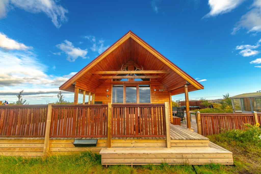 Détendez-vous dans ce confortable cottage en bois avec une cuisine privée, un bain à remous et un espace pour 6 près de Hvolsvöllur.