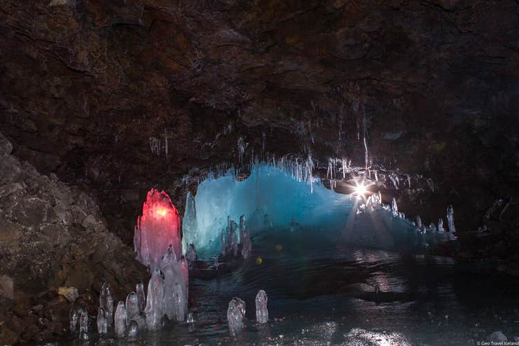Les parois des grottes sont souvent recouvertes d'une tapisserie de glace, créant des motifs et des textures. En fonction de la lumière et de la densité de la glace, celle-ci peut varier en couleur, allant de la clarté du cristal à des nuances de bleu. Le sol de la grotte est généralement irrégulier et recouvert d'un mélange de glace et de roches volcaniques, signe de l'origine volcanique de la grotte.