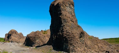 Hljodaklettar (‘Echo Rocks’) is a distinctive cluster of columnar rock formations, located by Jokulsargljufur in Vatnajokull National Park. Discover the natural wonders of this area on a self drive tour. Hljóðaklettar stand at the entrance to Vesturdalur, down by the river Jökulsá á Fjöllum. The columns lie at all angles and derive their name f