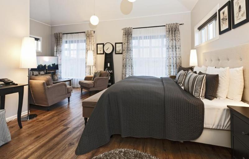 全室に高速Wi-Fi、美しいバルコニー、専用バスルームが備わっています。高い天井、広い窓、素朴でありながらモダンなスタイルも自慢です。 Hotel Grimsborgir にご宿泊のお客様は、敷地内の合計 29 か所のホットタブをご利用いただけます。