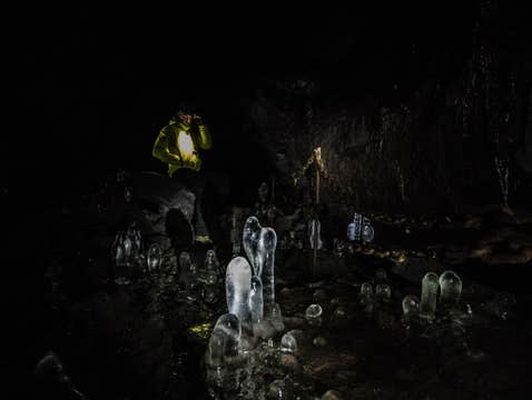 洞窟に到着すると、ヘルメット、懐中電灯、必要に応じてアイゼンなど、必要な装備一式をお渡しし、ベテランガイドが洞窟探検の重要なルールについて説明します。安全第一です。常にガイドの後ろを歩くこと、そして洞窟内では何にも触れないことを念頭に置いておきましょう。