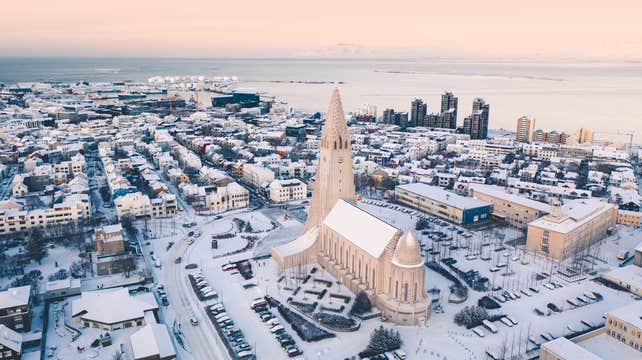レイキャビクのカラフルな家々がどんどん小さくなっていきます。ハットルグリムス教会(Hallgrímskirkja)やハルパ・コンサートホール(Harpa Concert Hall)の大屋根を越えてヘインギットル(Hengill)の地熱地帯へ。剥き出しの溶岩台地、熱水泉や噴気孔、美しい色の山々、発電所や不気味なクレーターなどを見ることができます。