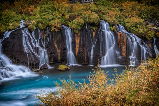 次に、幅900メートルの溶岩の崖を幾筋もの滝が流れる名所、フロインフォッサル(Hraunfossar)を訪れます。歩いてすぐのところにはバルナフォス(Barnafoss)というもう一つの滝があります。こちらは幅が狭く、岩場を轟くように流れるパワフルな滝です。