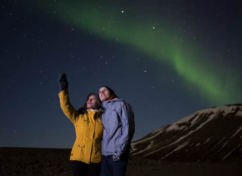 こちらのツアーでは、知識豊富なガイドと共に夜の大自然の中を巡ります。アイスランドの荒れた大地を走行できるよう改造されたスーパージープならではの機動力を活かし、大型バスでは行けない場所まで足を延ばすことができます。そのため、大勢の観光客を避けて、ゆったりとオーロラ観賞を楽しむことができます。