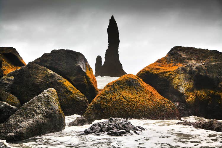 その後更に東へと進み、レイニスフィヤラ(Reynisfjara)のブラックサンドビーチを訪れます。黒い砂浜に巨大な波が白く砕け、黒い玄武岩の柱状節理の崖やミステリアスな海食柱が景色に趣を添えます。