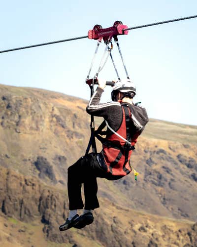 파트너나 친구와 함께 여행하는 경우 짚라인을 동시에 체험할 수 있습니다. 두 개의 라인이 평행하게 연결되어 아이슬란드에서 가장 긴 짚라인을 함께 체험할 수 있습니다.