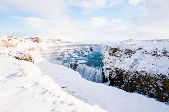 그 다음으로 향하는 곳은 강력한 자연의 힘을 감상하실 수 있는 굴포스(Gullfoss) 폭포입니다. 강력하고 막대한 양의 물줄기 바로 옆까지 다가갈 수 있는 산책로가 있어서 가보실 수 있습니다. 거대한 폭포수가 쏟아지는 폭포 근처에서는 물방울 미스트가 얼굴에 닿는 시원함을 직접 느끼실 수 있습니다!