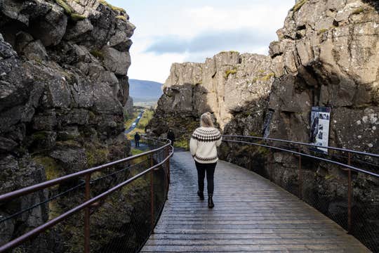 세 번째 목적지는 유네스코 세계문화유산으로 지정된 씽벨리르(Thingvellir) 국립공원입니다. 이곳은 북아메리카와 유라시아 지각판이 갈라지며 형성된 거대한 리프트 밸리에 자리하고 있어, 대륙 사이를 걷는 특별한 체험을 할 수 있습니다. 특히 알만나그야(Almannagja) 협곡은 두 지각판의 경계를 직접 눈으로 볼 수 있는 장소로 유명하지요.