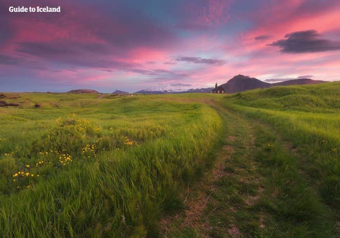 그런 다음, 주변 경관과 대비를 이루는 인상적인 외관이 특징인 부디르(Budir)의 상징적인 검은 교회인 부다키르캬(Budakirkja)를 방문합니다. 1703년에 지어진 이 역사적인 건축물은 단순함과 영원함을 상징하며 특유의 고요하고 영적인 분위기를 띕니다.