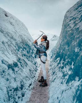 Je gids geeft je ook de uitrusting die je nodig hebt op de gletsjer, inclusief sneeuwschoenen en een ijsbijl. Je begint je wandeling en betreedt een nieuwe wereld vol ingewikkelde ijsformaties en intrigerende natuurfenomenen. Je ziet ijs dat vele honderden jaren oud is, diepblauw gekleurd door de ingesloten zuurstofbellen. Daarnaast kom je oog in oog te staan met een van de vele gletsjermolens, die de gletsjer van boven naar beneden hebben uitgehold.
