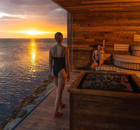 De sauna van Sky Lagoon is anders dan de meeste sauna's waar je ooit bent geweest. Hij is gebouwd met een enorm glazen raam dat een adembenemend uitzicht op de oceaan biedt terwijl je geniet van de warmte die je hele lichaam verkwikt.