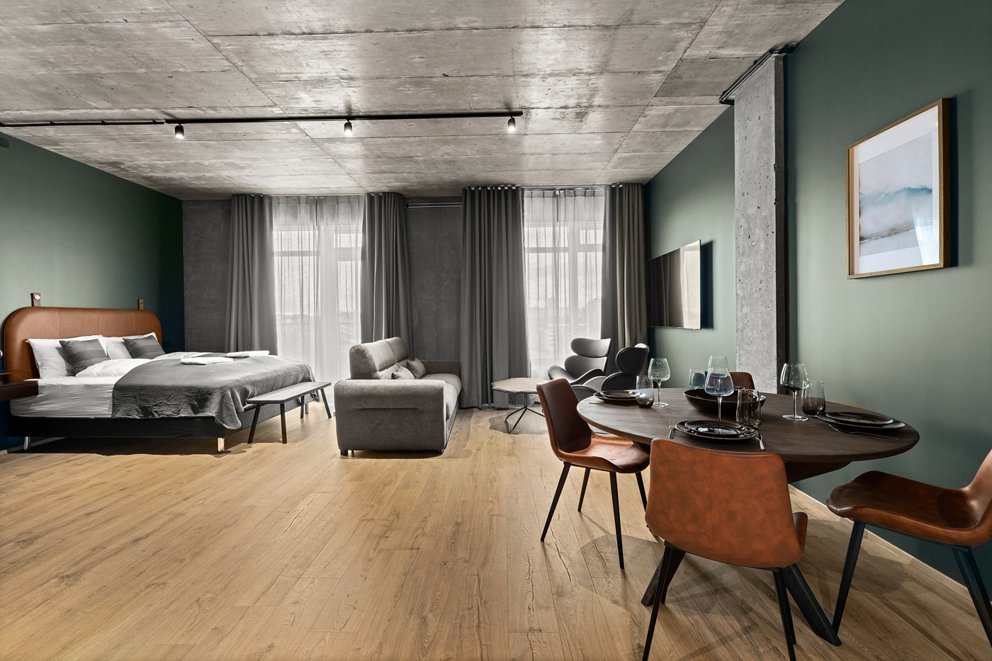 Each unit features a bright and open layout with a comfortable bed, a dining table with chairs, and a wardrobe. The large windows let in plenty of natural light and create a calm, relaxing atmosphere.