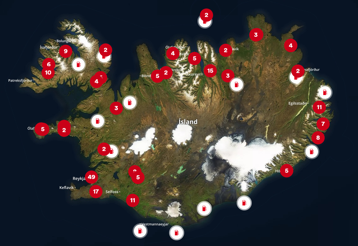 The most common in the country are the N1 gas stations. The cheapest gas stations are 'Orkan' and 'Atlantsolia'. Atlantsolia is only found in the southwest of Iceland, Egilsstadir and Akureyri, as they do not provide any assistance at the pump. Below you can find the location for Orkan and N1 gas stations.