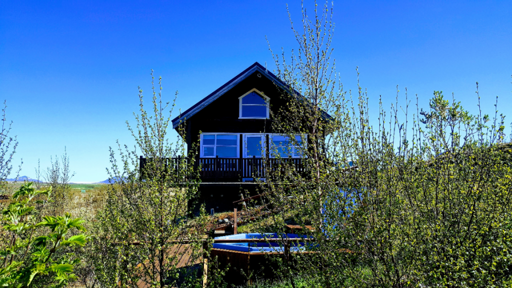 ผู้เข้าพักสามารถพักผ่อนบนลานกว้าง แช่ตัวในอ่างน้ำอุ่น และชื่นชมภูเขาอันงดงามของไอซ์แลนด์ในระยะไกล